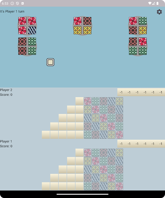 Selecione peças coloridas dos fornecedores para o seu tabuleiro de jogador. As pontuações são baseadas em como os jogadores posicionaram suas peças para decorar a parede.