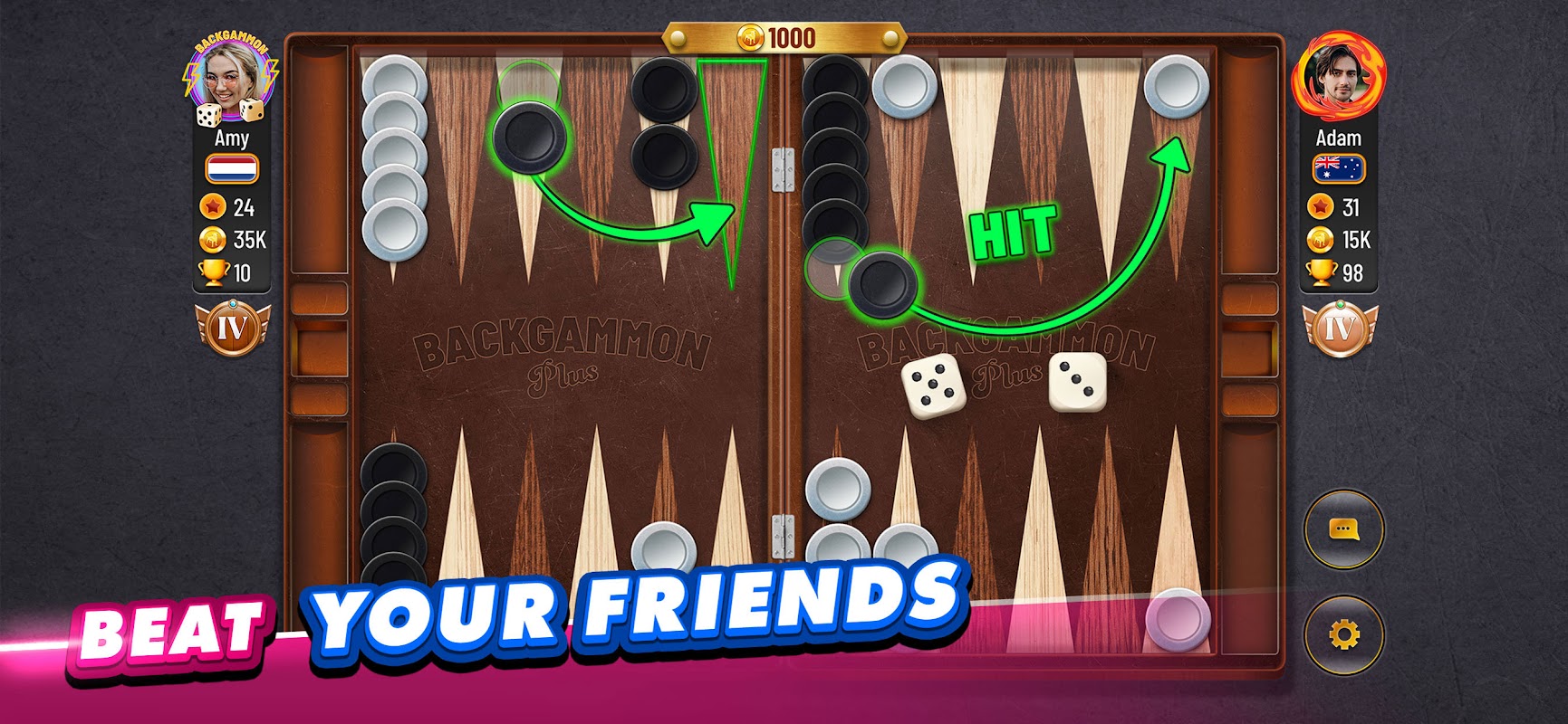 Desafie seus amigos ou encontre oponentes online para emocionantes partidas para dois jogadores. O Gamão é melhor aproveitado com um oponente à altura.
