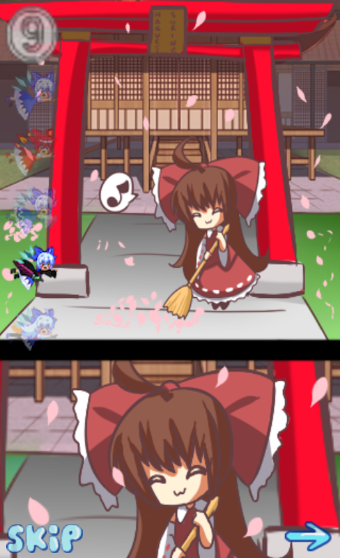 Playing a joke on Reimu went a bit too far and now she's in trouble! Help Cirno escape and fly away from Reimu's attack. Be sure to avoid running into shrine pillars or you will be hit! As an added bonus, there will sometimes be frog sitting atop of the shrine pillars which you can freeze by touching them which grants you 10 more 9-COIN points!