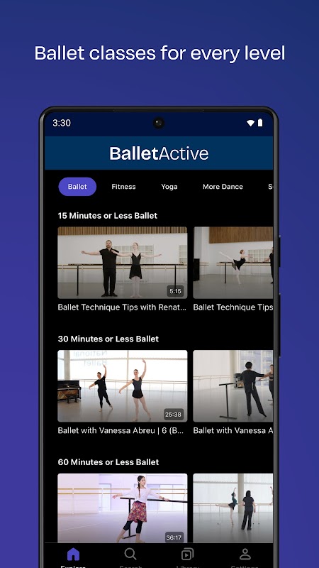 As aulas variam do nível iniciante ao profissional, projetadas para espaços pequenos ou para quem trabalha sentado, além de ioga para complementar sua prática de balé.