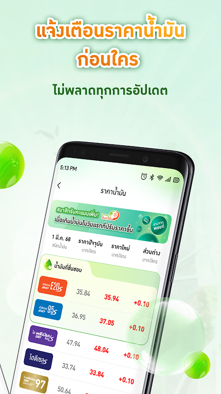 • Atualizações de preços de combustível: mantenha-se atualizado com as mudanças nos preços de combustível em tempo real e aproveite o benefício exclusivo "ขึ้นเท่าไหร่ คืนเท่านั้น", que o Bangchak é o único posto a oferecer. Os membros GreenMiles receberão a diferença de preço como pontos de bônus no dia do aumento.