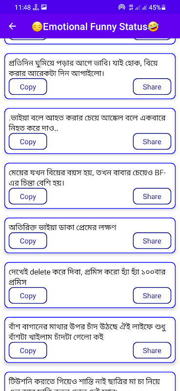 যারা বাংলা এসএমএস করেন তাদের কথা চিন্তা করে আমরা এই অ্যাপটিতে বাংলা এসএমএসও যুক্ত করেছি। যেখানে আপনি প্রায় 50 টি ক্যাটাগরি পাবেন।