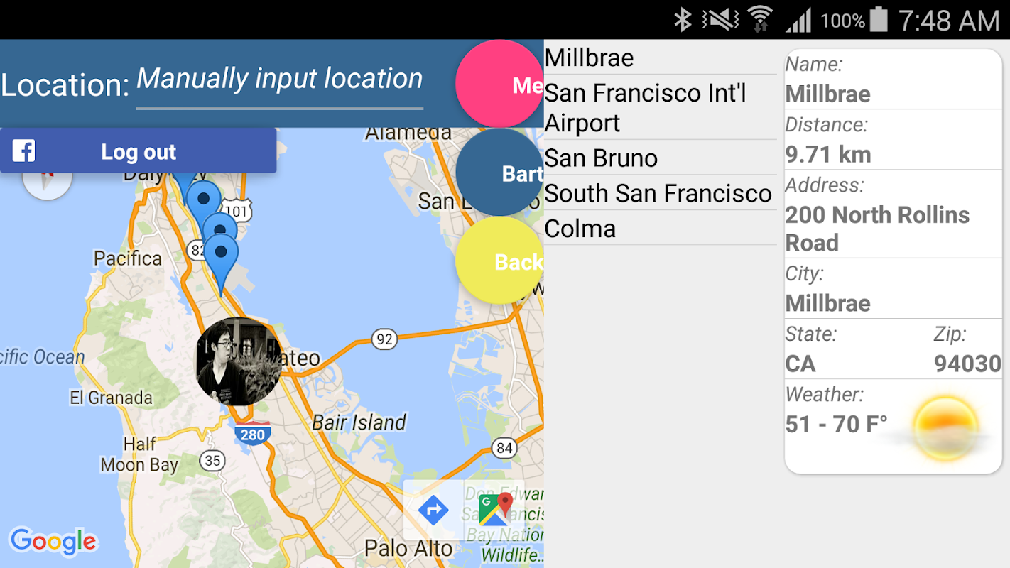 • Find 5 Bart stations the most close to either you or your input location or anywhere of the map you touch;