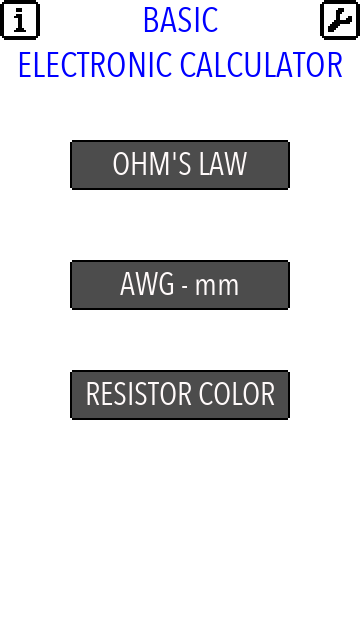 Tensão, corrente, resistência e calculadora de energia elétrica.