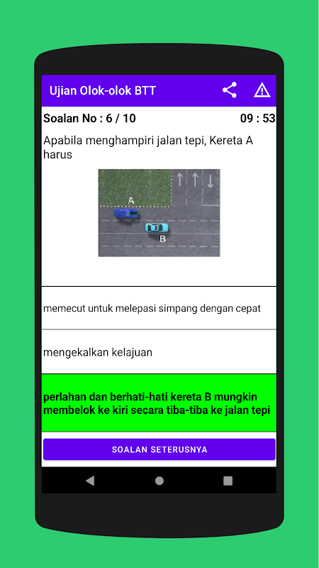 Soalan dalam aplikasi adalah berkaitan dengan kandungan buku panduan Ujian Teori Asas (BTT). Dan kami merujuk dengan sangat dekat kandungan dalam buku panduan Ujian Teori Asas (BTT) oleh itu jawapan kepada soalan boleh didapati dalam buku itu sendiri.