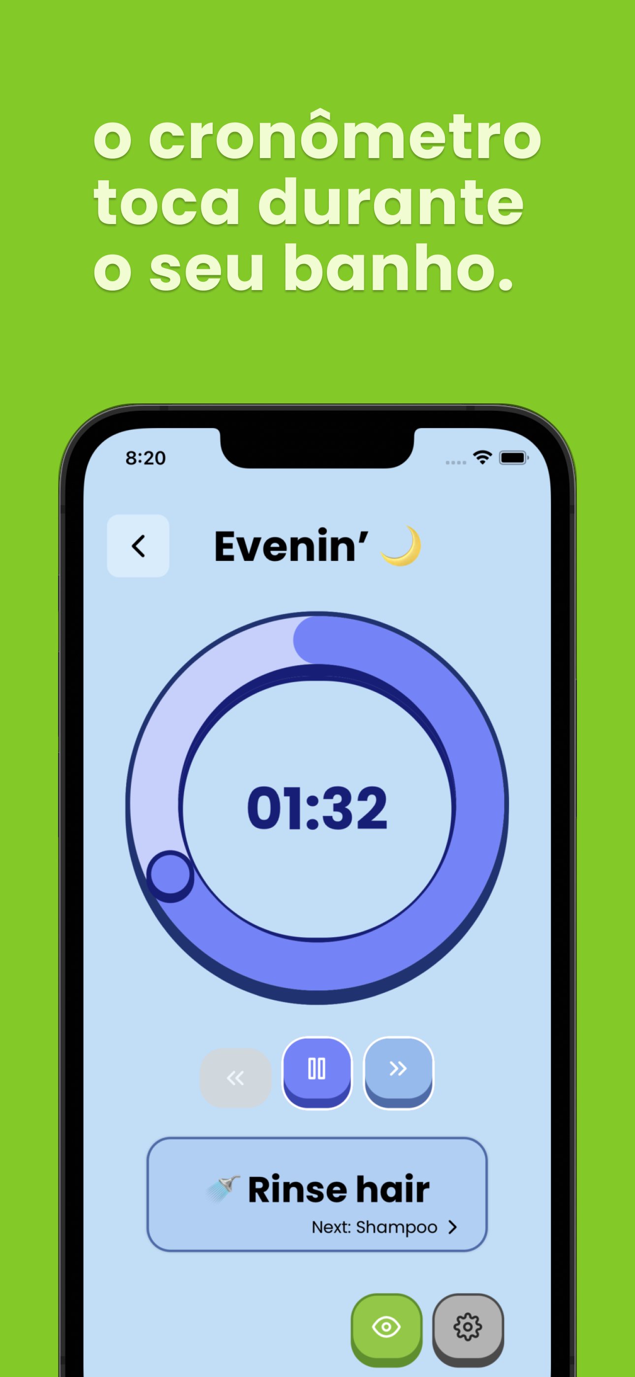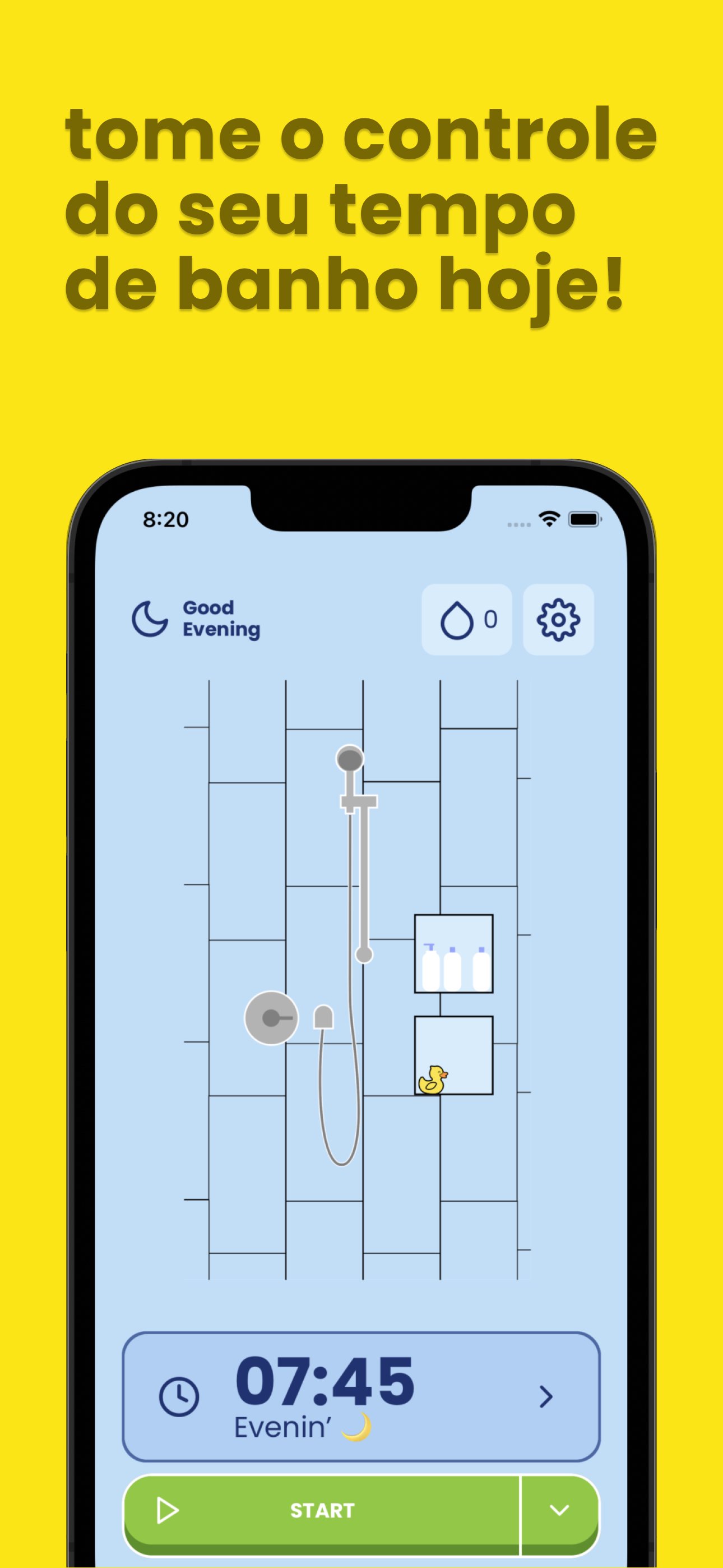 Quer economizar água? Você pode trocar para um chuveiro de baixo consumo de água, entrar no banho imediatamente ou tomar um banho mais curto com o Bathtimer! Se você deseja adotar um estilo de vida mais sustentável, economizando água, isso pode ser um desafio. Mas, uma vez que você tenha a meta de tomar um banho mais rápido, é necessário um jeito de executar esse plano! Com o Bathtimer, você pode criar um horário de banho previsível, definindo uma rotina para si mesmo, e o timer vai te ajudar a seguir essa rotina.