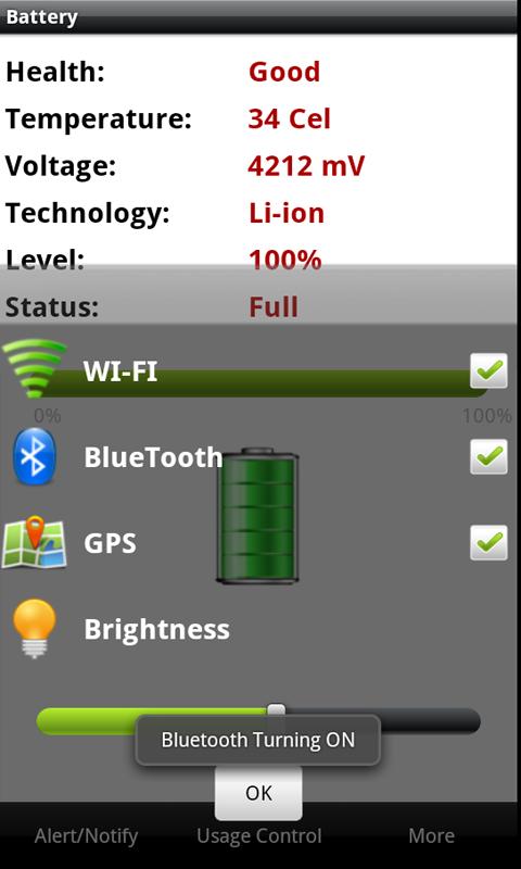 Battery can be controlled by controlling enabling/disabling of WIFI, GPS and BLUETOOTH within application itself. Brightness of the screen can be changed by sliding finger in application.