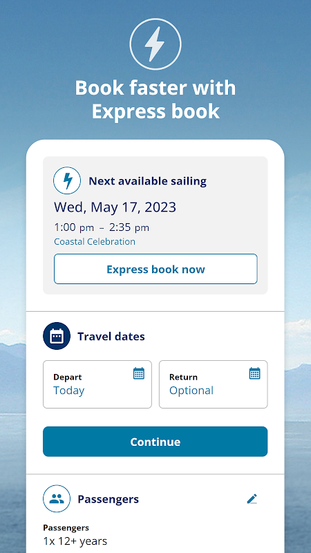 Apresentando um novo recurso de viagem para planejar e reservar viagens pessoais de balsa. Reserve travessias, gerencie suas viagens e verifique horários e condições atuais rapidamente com o aplicativo BC Ferries.