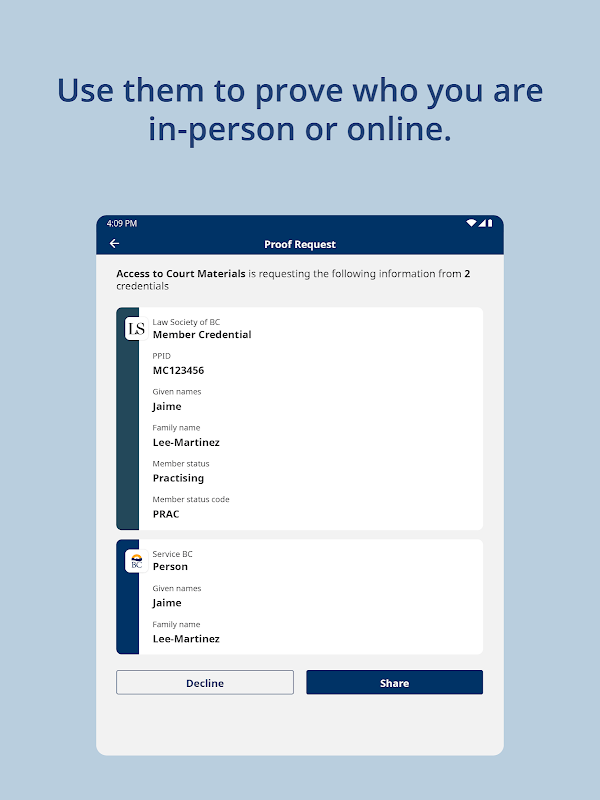 A privacidade é uma consideração importante no design da BC Wallet. Não somos informados quando você usa credenciais digitais em sua Carteira BC, a menos que você esteja usando essas credenciais para interagir conosco. Não registramos nenhuma análise para BC Wallet. Você aprova cada uso de suas credenciais digitais e fornece apenas as informações necessárias.