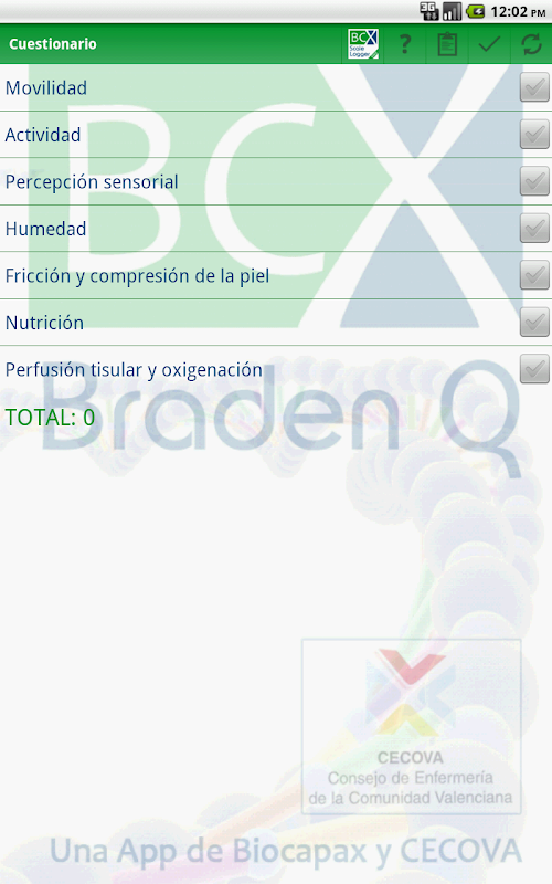IMPORTANTE: BCX Braden Q es una aplicación pensada para su utilización por personal sanitario, cualquier mal uso o uso inadecuado de ella no es responsabilidad de los creadores. El profesional siempre deberá verificar la corrección de la valoración generada por la aplicación que es meramente orientativa y basada en la escala original.