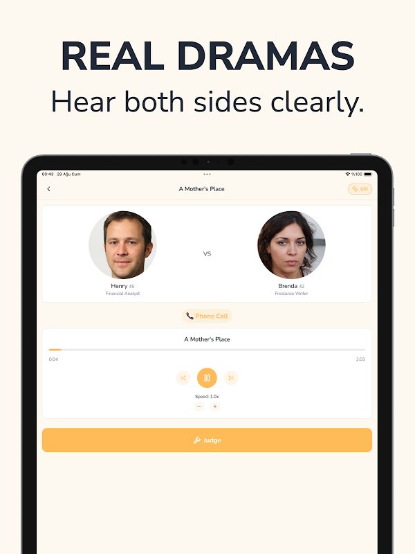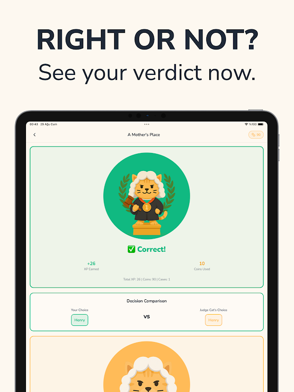 Escolha uma carta de cenário, ouça cada lado e dê seu julgamento — suas escolhas importam. Cada decisão atualiza seu perfil, desbloqueia novos casos e te impulsiona para cima no ranking global. Ganhe moedas, colecione conquistas e suba de nível conforme suas habilidades de julgamento melhoram. É um jogo de juiz, um jogo de decisão e um jogo social ao mesmo tempo — leia, debata, vote como um júri e decida quem está certo.