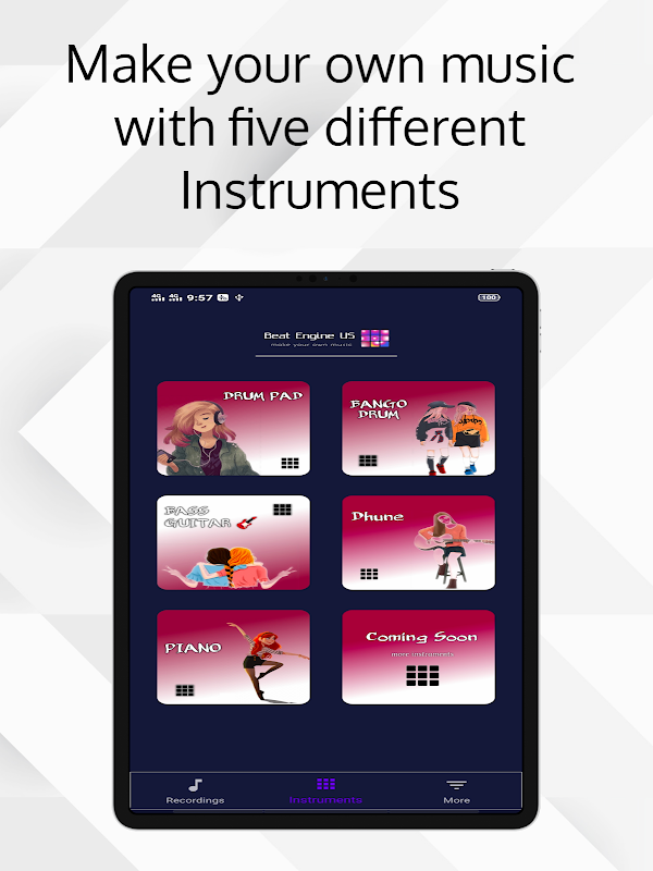 Beat Engine US is an amazing five instruments pads app that gives you the opportunity to make charming music, also with your voice and record it.