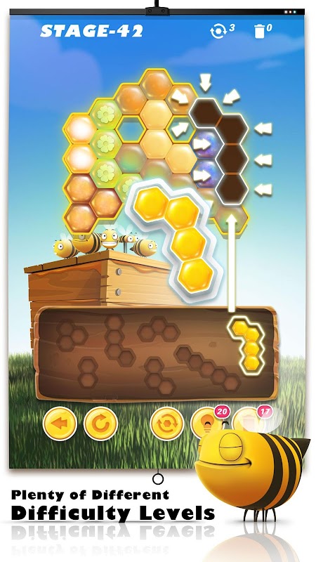 Bee nest puzzle is a exciting block puzzle game. A new and colorful sliding jigsaw game, with a huge amount of different shapes of honeycomb frames, 11 different stages of difficulty and 3000 levels to challenge your mental limits!
