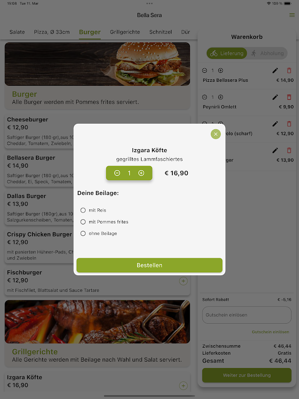 Peça comida de Bella Sera. Peça hambúrgueres, pizza, schnitzel e muito mais.