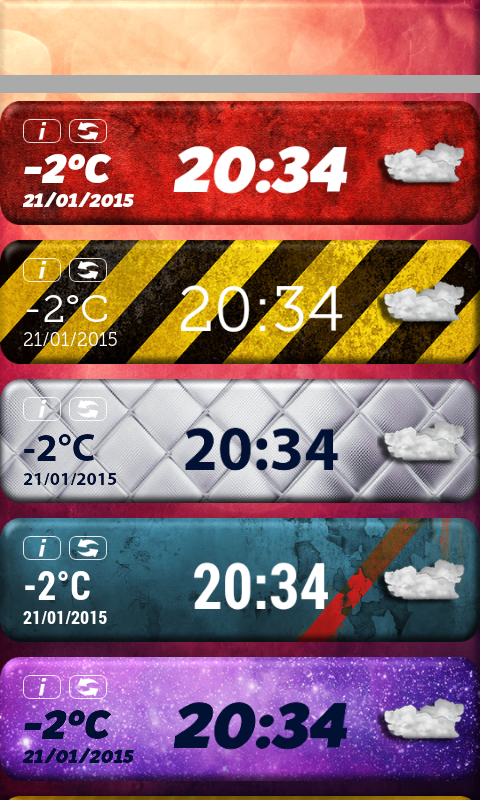 Criar tela olhar lindo com Widget fabuloso que mostra a previsão do tempo. Até agora você pode baixar widget de relógio regular, mas agora uma nova marca de relógio e widget do tempo está disponível totalmente gratuito. As condições do tempo será mostrado na tela juntamente com o seu relógio. Perfeito, você vai saber o que é o tempo lá fora está chovendo ou nevando ou é seco e ensolarado. Temperatura Tempo será exibida em graus Celsius ou Fahrenheit em que você possa ver se é quente ou fria. Não há necessidade de assistir o canal do tempo. Basta fazer o download "widget do tempo" e você vai saber o tempo do mundo e do tempo local. Escolha o local e obter as informações adicionais sobre o lugar que você quiser. Você vai conhecer a pressão, umidade, nebulosidade e velocidade do vento. Receba as melhores "widgets para Android ™" dispositivo e decorar sua tela! Basta selecionar desenho favorito e obter tela espetacular para o seu novo telemóvel Samsung Galaxy.