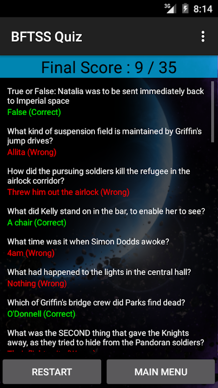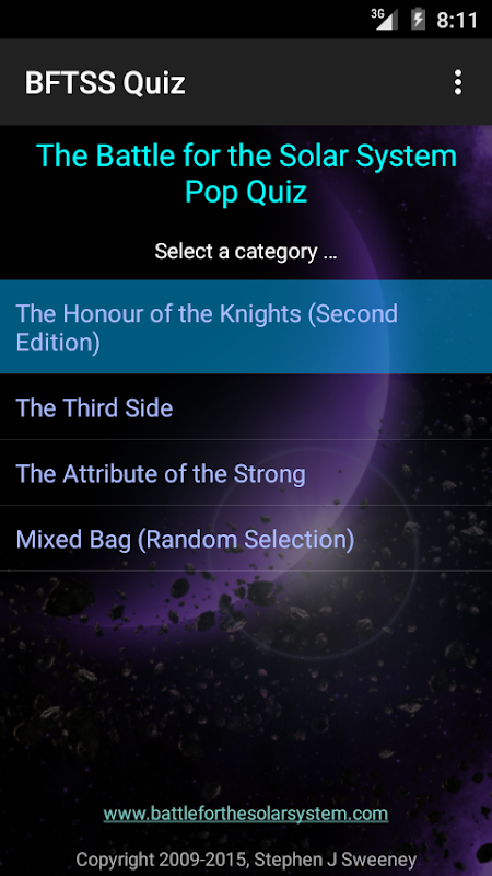 A pop quiz, allowing fans of the Battle for the Solar System space opera novel series to test their knowledge. Over 1,000 questions available for HONOUR OF THE KNIGHTS (First Edition), HONOUR OF THE KNIGHTS (Second Edition), THE THIRD SIDE, and THE ATTRIBUTE OF THE STRONG!