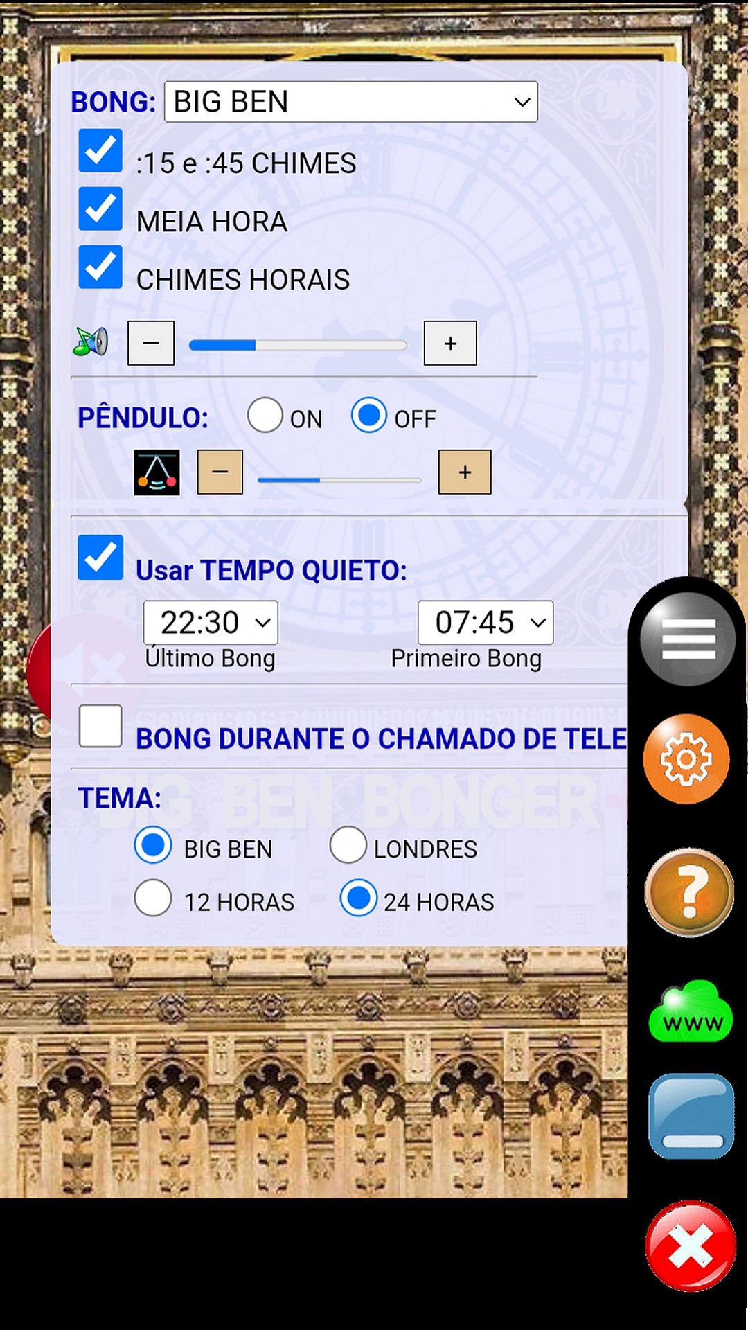 A cada 15 minutos, este aplicativo pode soar como o Big Ben ou qualquer um dos vários outros relógios - mantendo você ciente das horas de uma maneira atraente e não intrusiva. É divertido andar o dia todo tocando como o Big Ben. Você será notado.