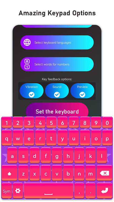 Teclado grande para Android, como você pode ver, é super fácil de instalar e definir o aplicativo de troca de fundo do teclado de néon. E, o que é melhor, este aplicativo de teclado estético permite que você altere os fundos e digite com caracteres especiais para o seu idioma. Além disso, recursos como atalhos de previsão de texto, teclas grandes e sons de digitação tornam toda a experiência incrível. Nossos teclados estéticos têm um design simples e fácil de usar que será ótimo para todos que procuram aplicativos de qualidade. Obtenha muitos teclados legais e digite sem esforço o dia todo!