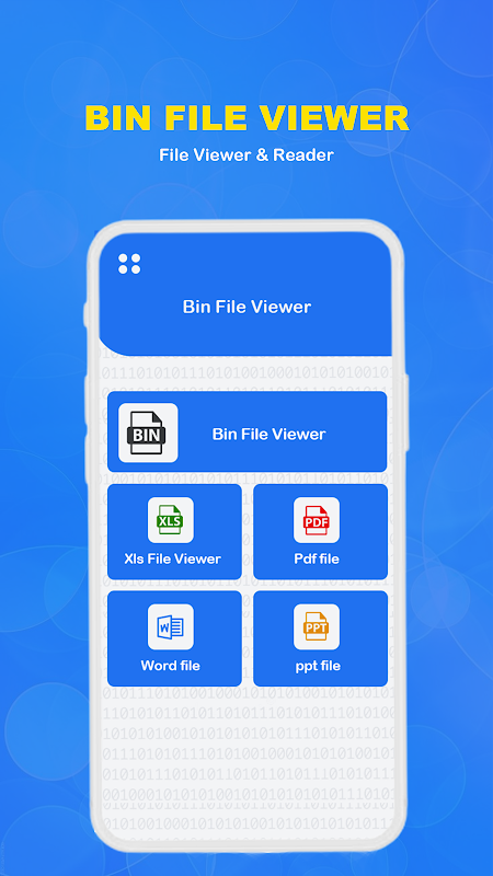 Você pode ler arquivos bin facilmente usando nosso aplicativo Bin Opener. Se você precisa gerar um arquivo binário de qualquer foto, documento do Word ou documento PDF, este File Viewer para Android simplifica isso. Se você está procurando o aplicativo Bin Viewer: Binary File Opener, o aplicativo Bin File Opener: Bin Viewer é a escolha perfeita para você. O Binary File Viewer é totalmente gratuito para usar, sem nenhum custo necessário.