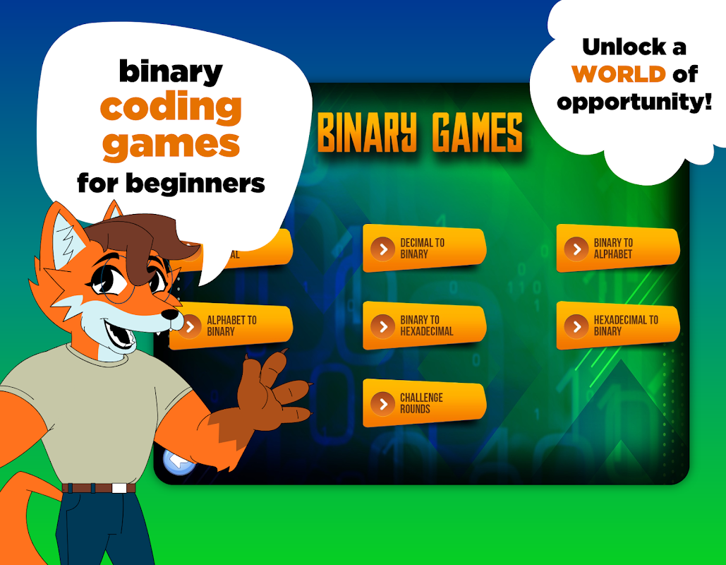 Com Binary Games, você aprende o básico em programação de computadores e desenvolve uma grande base no mundo da computação, jogos e muito mais! Com recompensas, jogos multiplayer e jogos de desafio, você pode levar o aprendizado multissensorial a novas alturas!