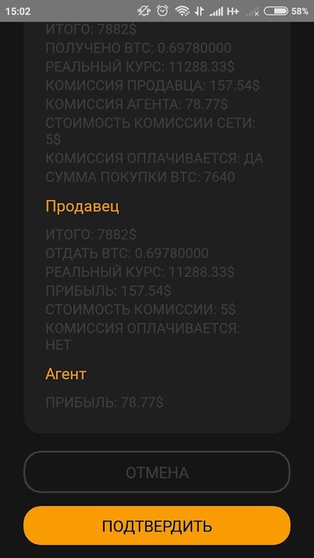 Расчёт прибыли для покупателя, продавца и посредника в сделке по покупке/продаже Bitcoin.