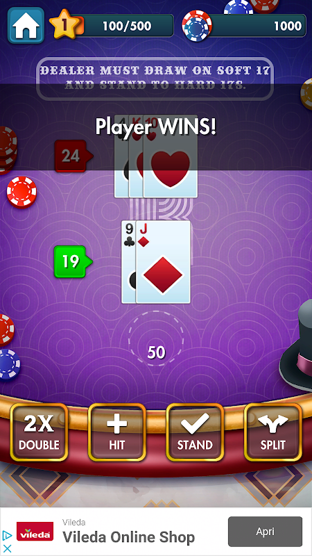O jogo é gratuito e todo o dinheiro que você pode ganhar jogando BlackJack é virtual e não real.