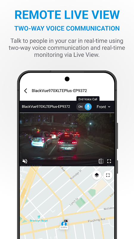 Aproveitando uma conexão de Internet móvel ou incorporada ao carro e uma câmera de painel BlackVue, o BlackVue Cloud conecta você ao seu carro por meio da nuvem. Usando o aplicativo BlackVue em seu smartphone ou tablet, você vê em tempo real onde seu carro está localizado e o que está acontecendo ao seu redor.