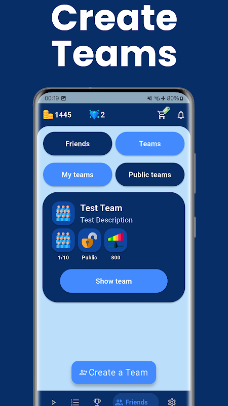 Isto é mais do que apenas mais um quebra-cabeça de blocos. No Jogo Diário de Quebra-cabeça de Blocos, você pode entrar ou criar uma equipe. O melhor tempo da sua equipe conta para os resultados. Trabalhem juntos, incentivem uns aos outros e aproveitem uma nova maneira de experimentar jogos relaxantes de quebra-cabeça de blocos. Ao contrário de outros aplicativos de quebra-cabeça, você não precisa de multijogador em tempo real para se sentir conectado – o trabalho em equipe acontece naturalmente por meio de conquistas compartilhadas.