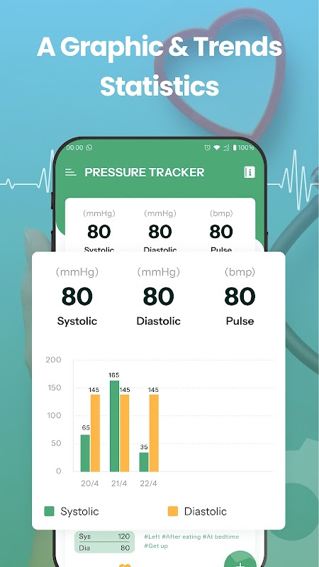 Este aplicativo verificador de pressão arteria é confiável e seguro, calcula e dá conclusões rápidas sobre a zona de pressão arterial do usuário. A pressão arterial anotada no diário é muito flexível em termos de tempo, dependendo das necessidades do usuário.