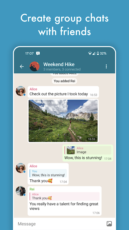 O bate-papo Bluetooth permite que você envie mensagens privadas e em grupo por Bluetooth sem necessidade de internet. Com o Bluetooth Chat você pode se comunicar com amigos próximos enquanto estiver na natureza, em um trem, avião ou qualquer outro ambiente sem internet.