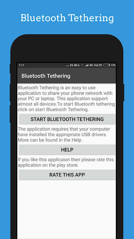 Bluetooth Tethering is an easy to use application designed for the users those who are using PC and has no connection of network or internet connectivity. Bluetooth Tethering application allows you to share your phone network with your PC, Laptop, Television, and other devices. Bluetooth Tethering contains a very responsive layout that allows you to operate this application both in landscape mode the main mode. This application contains a very limited number of advertisements. Bluetooth Tethering is totally coded in java language and support almost all flavors and API of Android devices. Bluetooth Tethering supports almost all devices based on the android operating system.