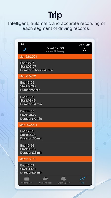 Battery Monitor BLE é um aplicativo de monitoramento de bateria de carro, que pode monitorar a tensão da bateria do carro em tempo real; conte a tensão histórica da bateria; ele pode testar automaticamente a tensão de inicialização da bateria e suportar testes de carregamento inativo e de alta velocidade. Todos os dados são sincronizados com o aplicativo móvel via Bluetooth.