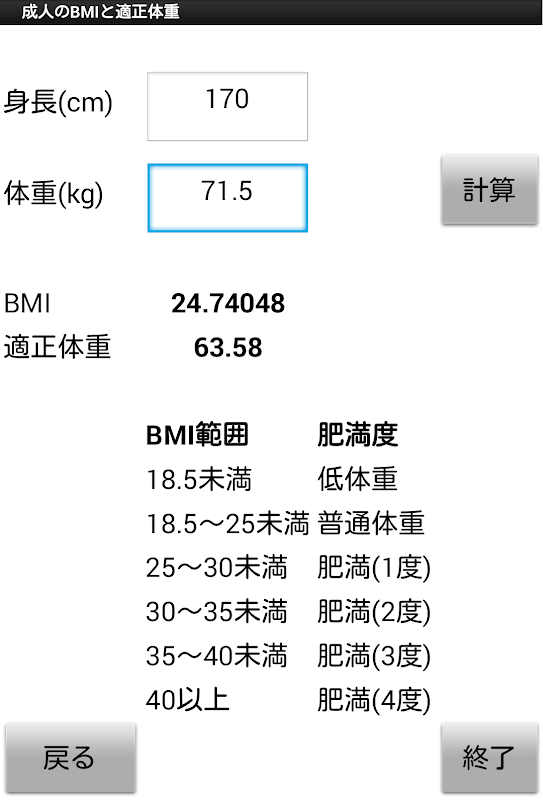 以上の操作で簡単にBMIなどの肥満度を計算できます。
