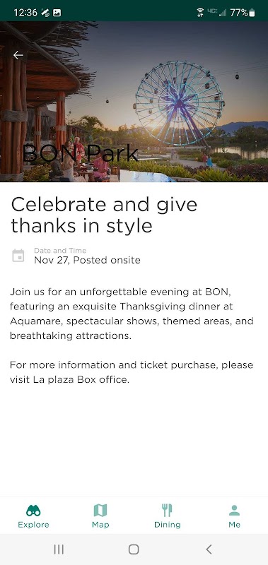 • Descubra atrações: explore as incríveis atrações e experiências exclusivas do BON, com detalhes e horários de funcionamento. Da Vista Wheel ao Floresta Drop, desfrute de passeios inovadores e aventuras envolventes.