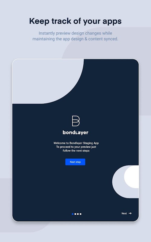 O Bondlayer Staging App permite visualizar e testar seus projetos do Bondlayer no seu dispositivo. Este aplicativo requer que você insira um código PIN disponível na seção de publicação do seu projeto, faça login na sua conta (app.bondlayer.com) para ver seus projetos.