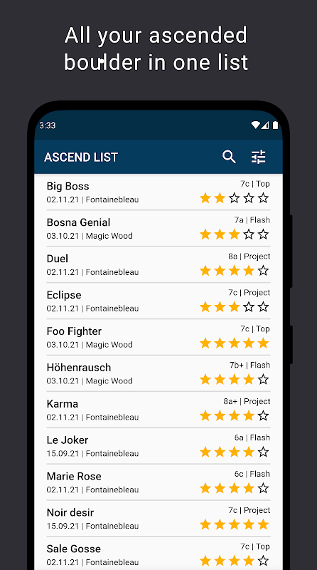 Log all of your bouldering activities. Easily save your ascends in this app. Specify the grade, style, name, and give it a rating. Clear statistics are created from the data, so you always have an optimal overview of your progress.