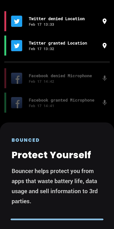 O leão de chácara oferece a capacidade de conceder permissões temporariamente. Deseja marcar um local ou tirar uma foto, mas não deseja que o aplicativo possa usar a câmera ou obter sua localização sempre que desejar? O segurança dá exatamente isso. Assim que você sair do aplicativo, o Bouncer removerá automaticamente a permissão para você em um instante, para que você possa voltar a fazer o que faz de melhor, sem precisar se preocupar com aplicativos invadindo sua privacidade e gastando sua bateria.