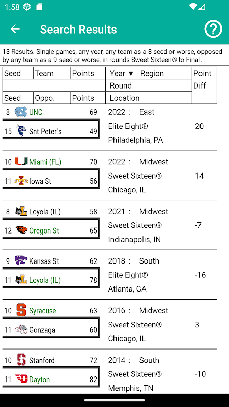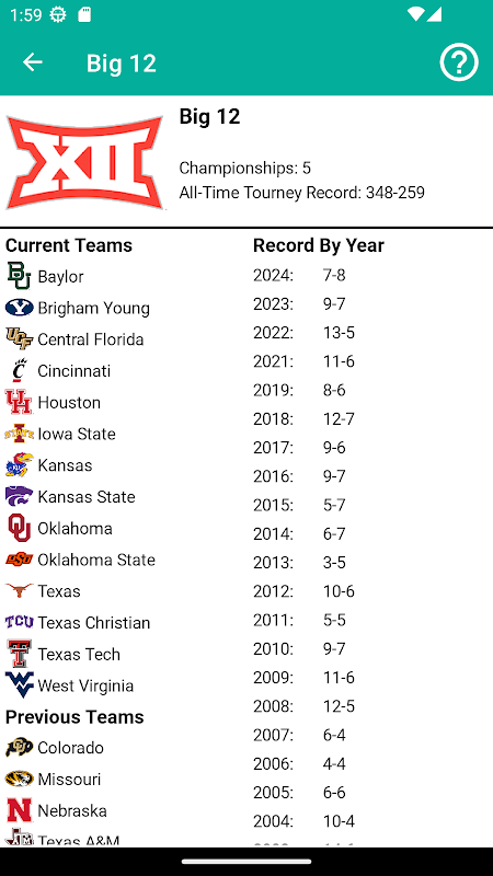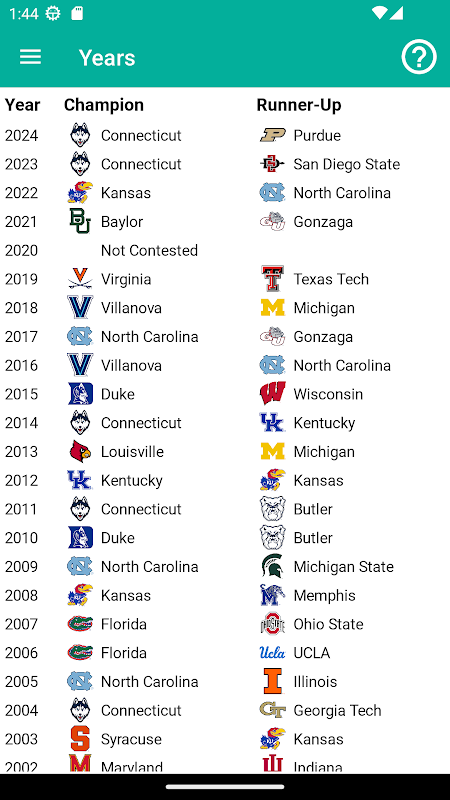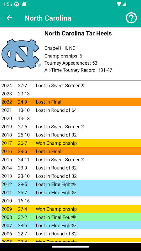 O Bracket Master apresenta o histórico completo do Torneio de Basquete Universitário Masculino. Todos os jogos do torneio são apresentados, desde o campeonato inaugural de 1939 até os dias atuais. Cada uma das mais de 85 tabelas de campeonatos pode ser examinada dentro do aplicativo.