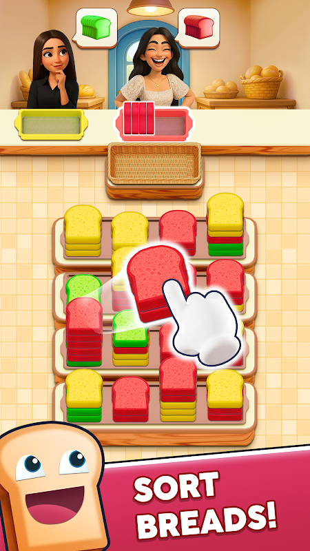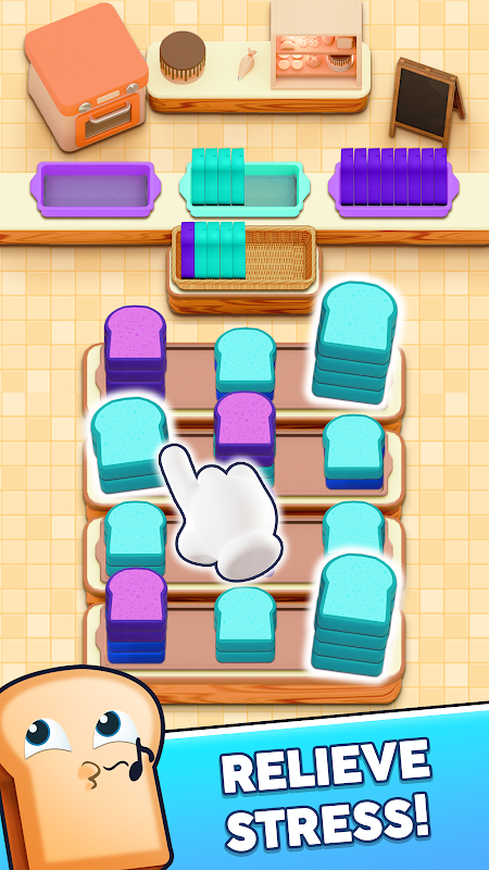Seu objetivo é simples: toque em pilhas de fatias de pão coloridas e organize-as nas bandejas corretas acima. Somente fatias que combinem com a cor da bandeja podem ser adicionadas. Se não combinarem, elas serão movidas para a cesta de espera — e se essa cesta transbordar, você passa de fase. Planeje seus toques com cuidado e mantenha o foco para manter tudo sob controle.