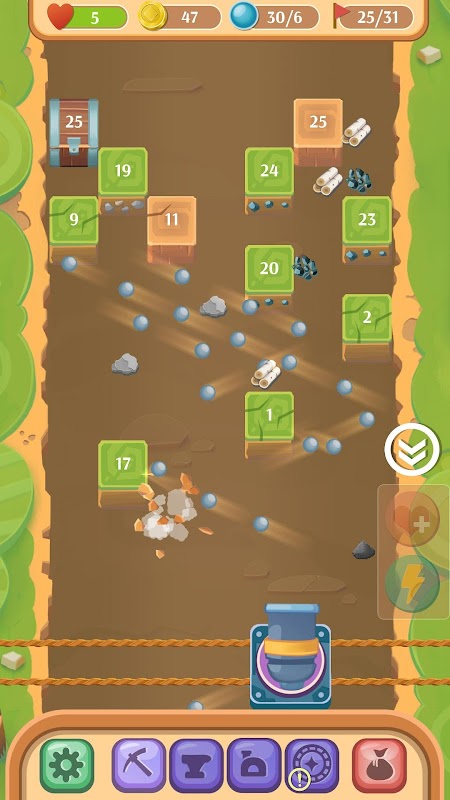 Исследуй случайным образом генерируемые пещеры. Запусти цепочку отскакивающих шаров в качестве кирки. Разбей как можно больше блоков, не дай блокам разрушить твою пушку. Находи сундуки с сокровищами. Добывай ресурсы: уголь, дерево, камень, порох, веревку, порох, железо, золото, медь, алмазы, рубины и прочую руду. Используй руду и печь для получения новых ресурсов.