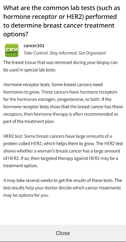 Este é simplesmente o número 1 pedido de câncer de mama que contém respostas para suas perguntas sobre o câncer de mama em suas pontas do dedo. O aplicativo é totalmente gratuito para uso e destina-se exclusivamente para ser útil para pacientes com câncer de mama e seus entes queridos tentando entender seu diagnóstico de câncer de mama, como o tipo, estadiamento e classificação, testes incluindo testes de receptores hormonais, opções de tratamento, incluindo opções cirúrgicas, quimioterapia , radiação, imunoterapia, taxas de sobrevida em 5 anos com base no diagnóstico. Ele também contém perguntas para ajudar a facilitar discussões com seus médicos sobre cirurgias, diagnósticos e planos de tratamento.
