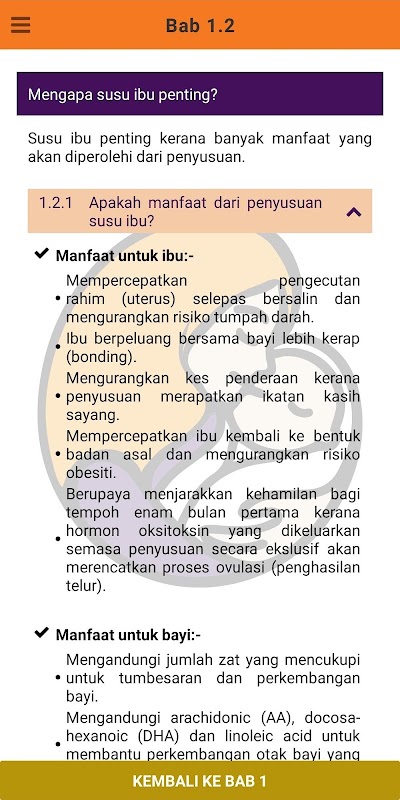 Aplikasi ini bertujuan memberi panduan mudah kepada ibu bekerja cara mempraktiskan penyusuan susu ibu secara eksklusif untuk enam bulan pertama. Aplikasi ini juga memudahkan para ibu bekerja mempelajari teknik betul penyusuan susu ibu pada masa yang sesuai untuk mereka. Aplikasi ini menjadi panduan asas kepada persediaan awal bagi memastikan penyusuan susu ibu dan mempelajari sendiri teknik penyusuan susu ibu dengan betul dan berkesan.Ibu boleh mengenalpasti masalah penyusuan serta cara penyelesaian.