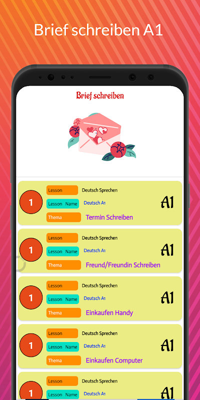 Brief schreiben Deutsch A1 ist eine einzigartige App für Lernende, die Deutsch kurz schreiben lernen möchten. Die besten Beispiele von Briefen für die Prüfung wurden Schritt für Schritt gegeben. Brief schreiben Deutsch A2 ist eine einzigartige App für Lernende, die Deutsch kurz schreiben lernen möchten. Wer die deutsche Sprache mit Hilfe der Android-App lernen möchte, für den ist es die beste Möglichkeit, die deutsche Sprache zu verbessern.