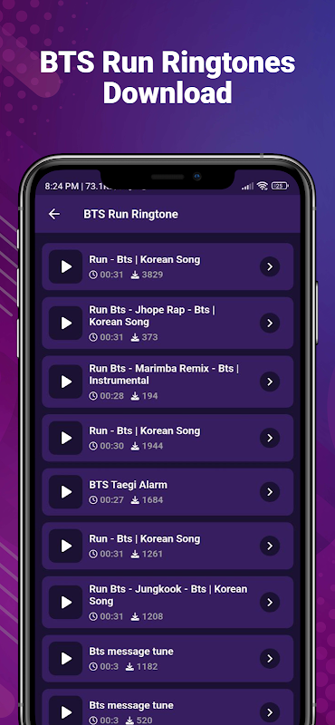O novo e quente "Ringtone" do popular grupo de boyband BTS da Coreia do Sul apresenta mais músicas para o seu celular, com diferentes especialidades que o tornam apaixonado por música. O "BTS" consiste em 7 membros são RM, Jin, Suga, J-Hope, V, Jimin e Jungkook.