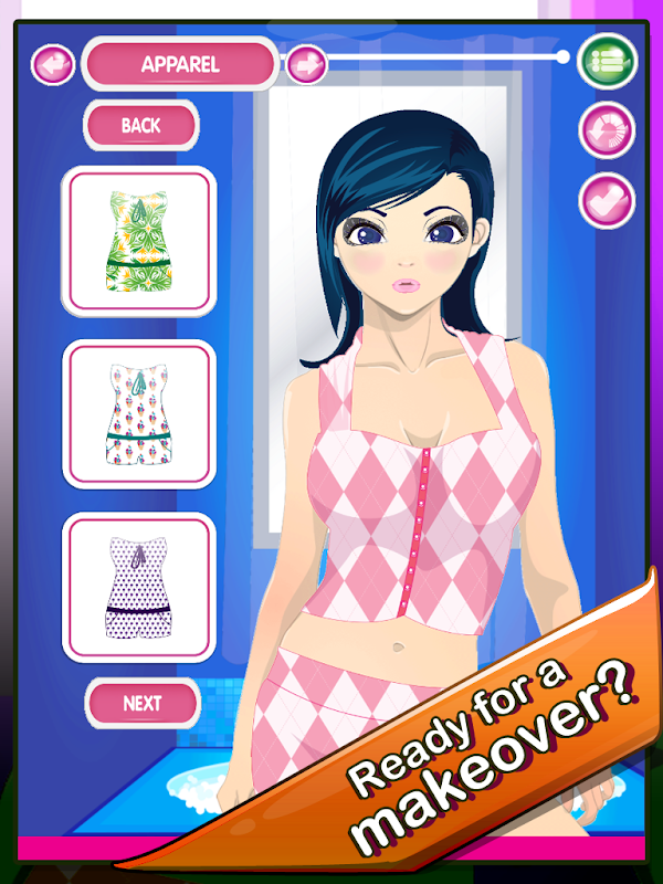 - Style her hair, skin, eyes, eyebrows, lipstick, clothing, by selecting color and style
