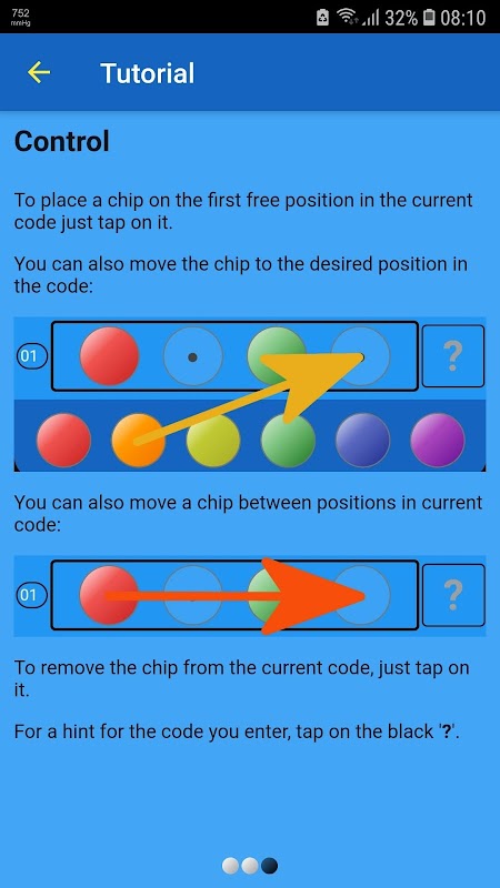 The code is a sequence of colored chips, depending on the settings the secret code can contain 4, 5 or 6 chips. They can be repeated (no more than two chips of the same color for codes with 4 and 5 chips and no more than three chips in the same color for 6 chips codes.)