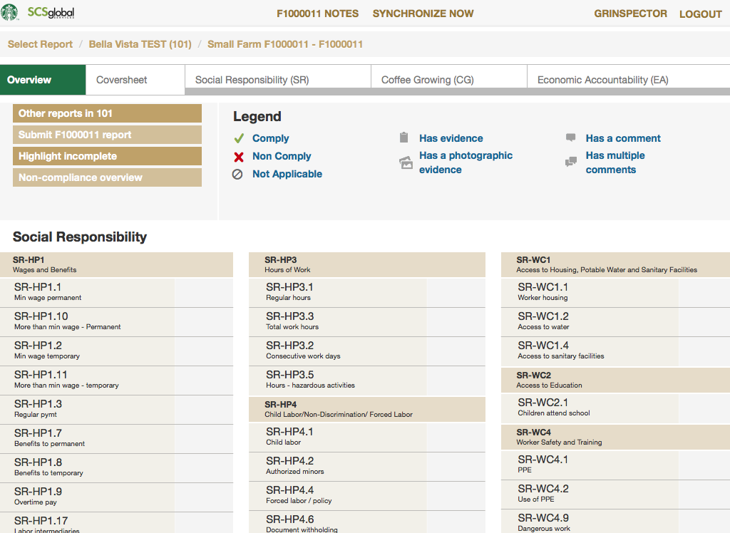 Inspector relatórios app para C.A.F.E. Práticas e verificações Práticas de cacau