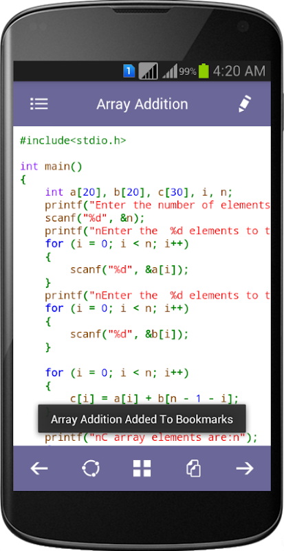 - Programação em C Simplificado também possui um recurso de bookmarking em que você pode literalmente marcar nada ou seja, qualquer exemplos de programação C, C Qualquer Programação Guias de Referência, Qualquer C Programming Aptidões, qualquer tipo de programação C K & RC exercícios de programação Resolvido e mais que tudo será listados em um único segmento de gerenciamento de favoritos fácil