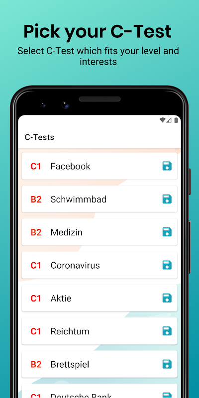 O C-Tester é uma plataforma de testes no idioma alemão, desenvolvida para os alunos para ajudá-los na preparação para o exame de ingresso no Studienkolleg. Com o C-Tester , você não precisa pagar por cursos de aprendizado bastante caros para se preparar para um teste de entrada no idioma alemão (C-Test) em Studienkolleg. Cada teste C é revisado e avaliado pela equipe do testador C para garantir a melhor qualidade de preparação para você!