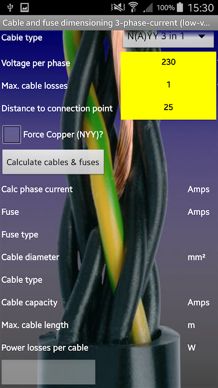 O aplicativo calcula que funde e cabos são recomendados para uso para uma certa quantidade de corrente e tensão em determinadas circunstâncias, como as perdas de cabo, cabos por conduto, comprimento do cabo para ponto de conexão e diferentes tipos de cabos.